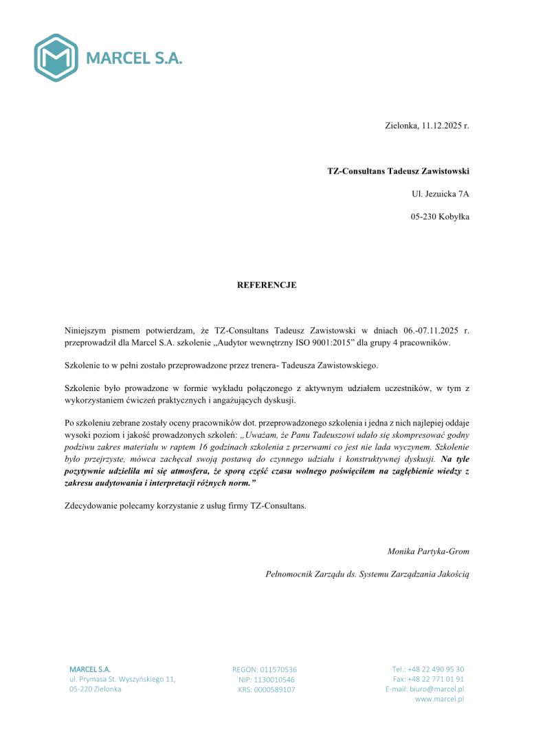 Konsultacje przy opracowaniu, wdrożeniu i doskonaleniu systemu zarządzania jakością (SZJ) zgodnego z normą ISO 9001, jak również innych metod i technik zarządzania jakością np. KAIZEN, 5S.