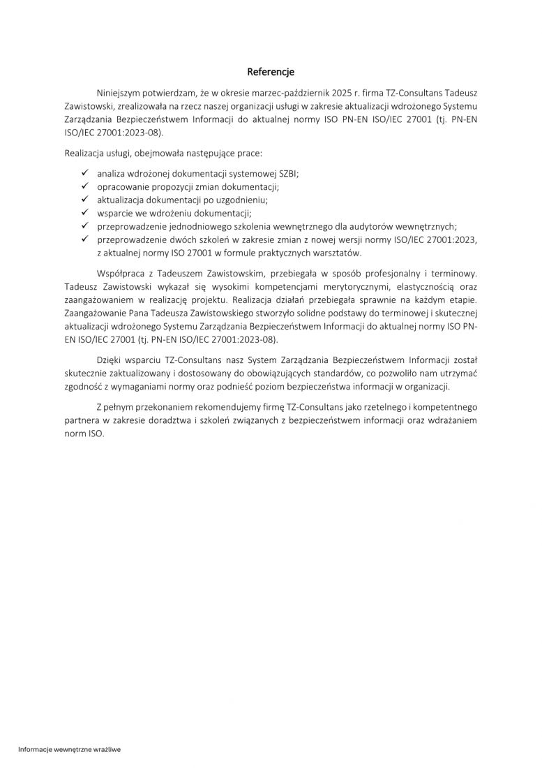 - Konsultacje przy opracowaniu, wdrożeniu i doskonaleniu SZBI;